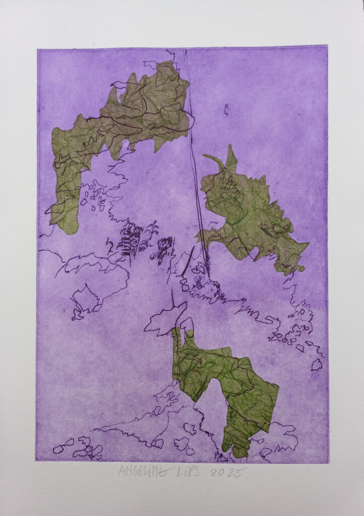 “In mijn tekeningen en schilderijen ben ik er niet op uit de zee en de bergen realistisch weer te geven. Wat ik aan ruimte ervaar door kleur en licht is meer een ondergedompeld zijn in de natuur dan, vanaf een afstand, observeren hoe de natuur in elkaar zit.” zegt Angeline.