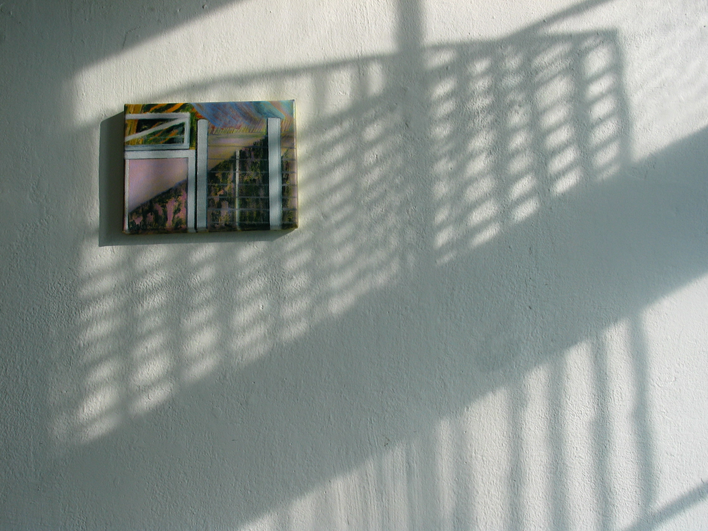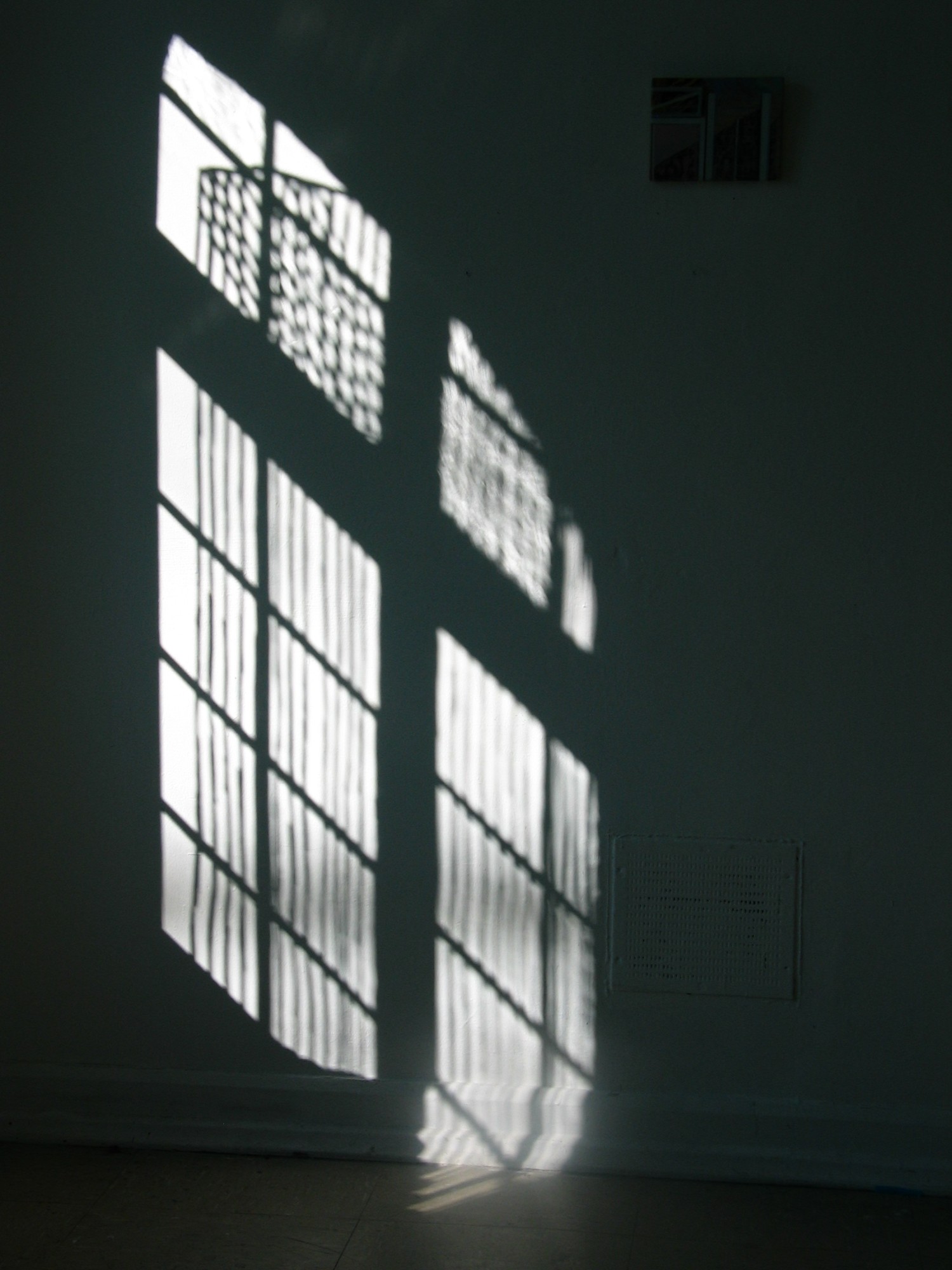 Ik plakte fijne dunne stroken transparant blauw papier over de gehele lengte op alle ruiten in de ruimte, waarbij ik ertussen steeds een strook open liet.
